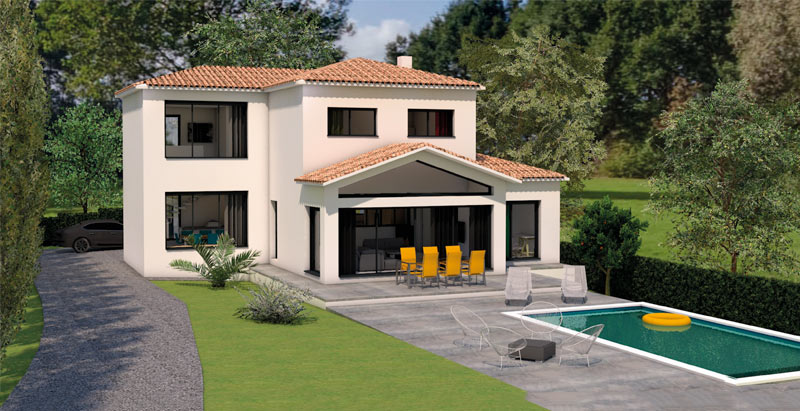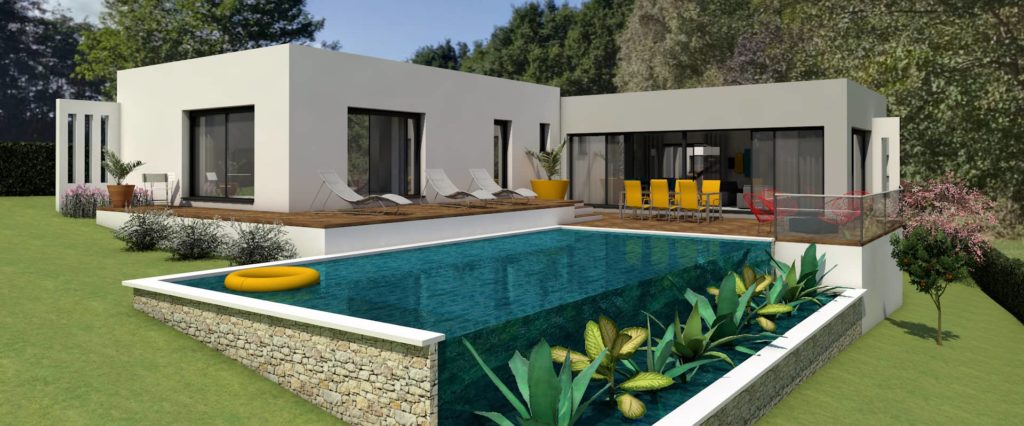 Construction de maison aux lignes modernes, terrasse à l'étage, solarium, piscine, construction Maison Maddalena